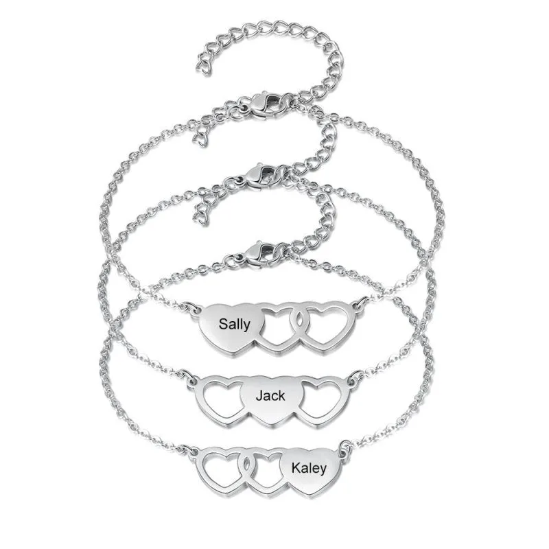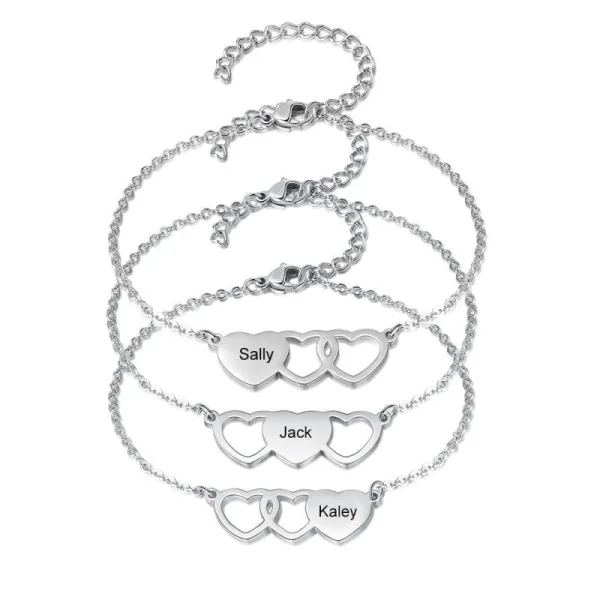 Mettez en valeur votre sentiment avec notre bracelet personnalisé, offrant la possibilité de faire graver jusqu’à trois prénoms. Les trois cœurs entrelacés symbolisent l’amour éternel et les liens durables. Conçu en acier inoxydable de haute qualité, ce set de bracelets résistant à l’eau est le cadeau personnalisable idéal pour exprimer votre affection à votre bien-aimé(e). L’ajustement de la chaîne garantit un port agréable pour tous.